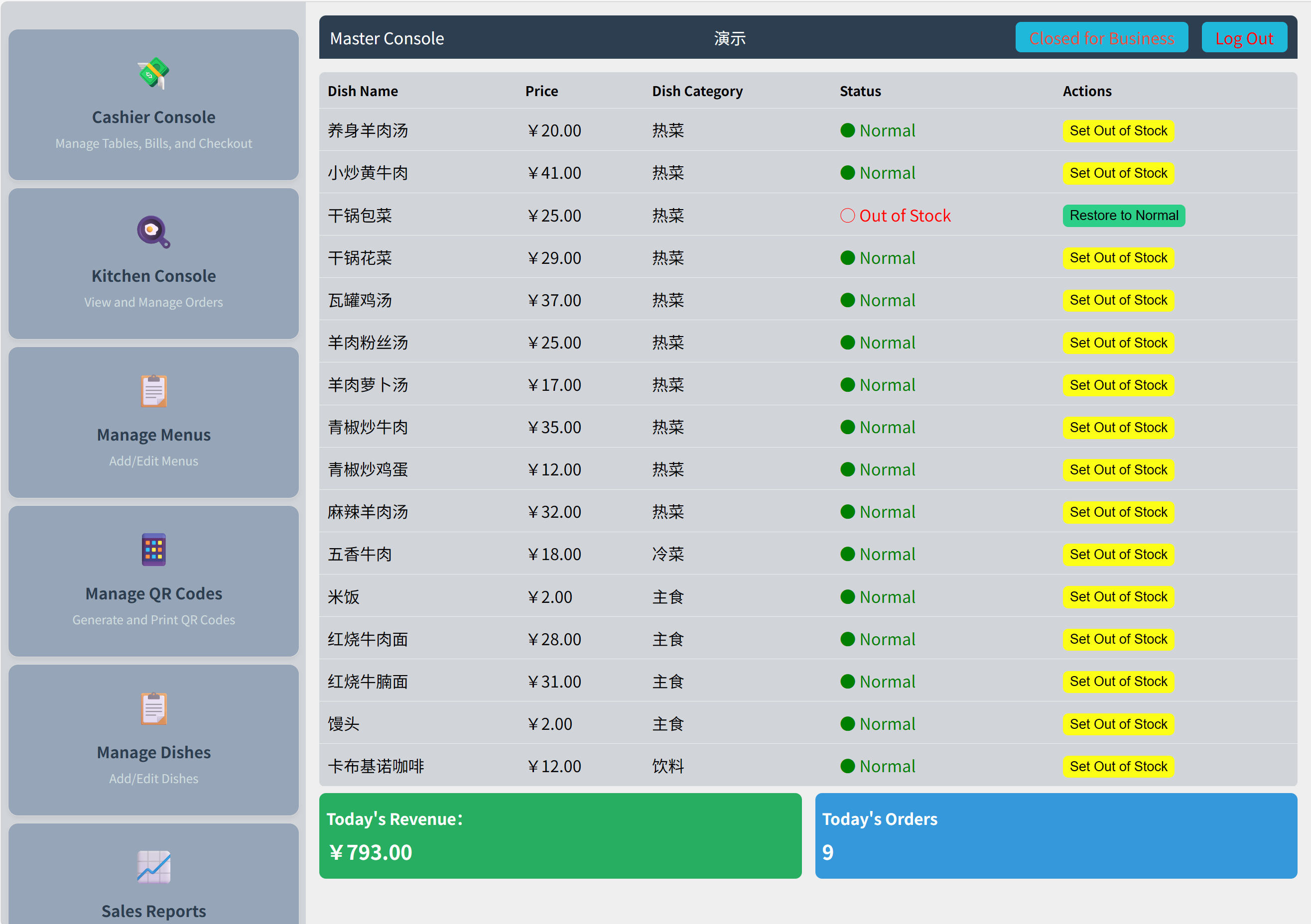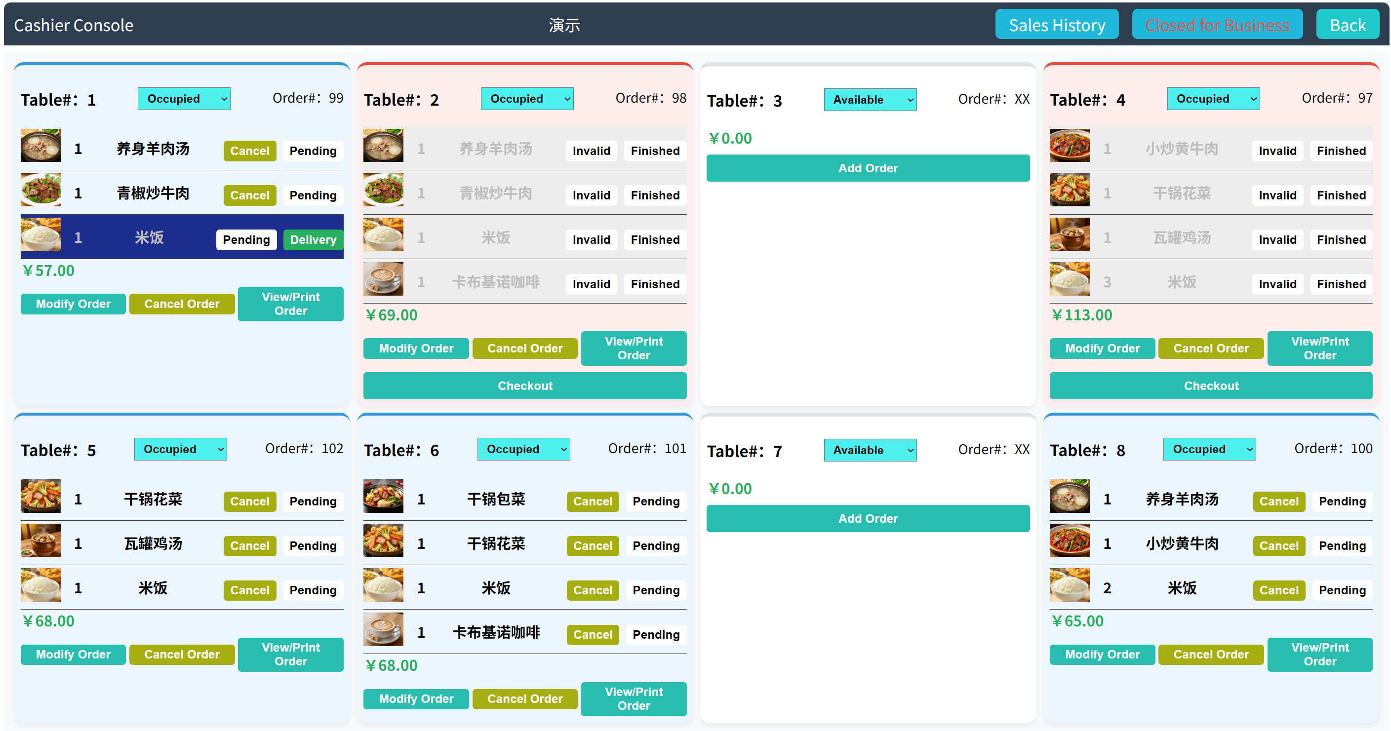 Monitor and control tables, orders, menu items, food delivery, billing and payment collection, and order printing.