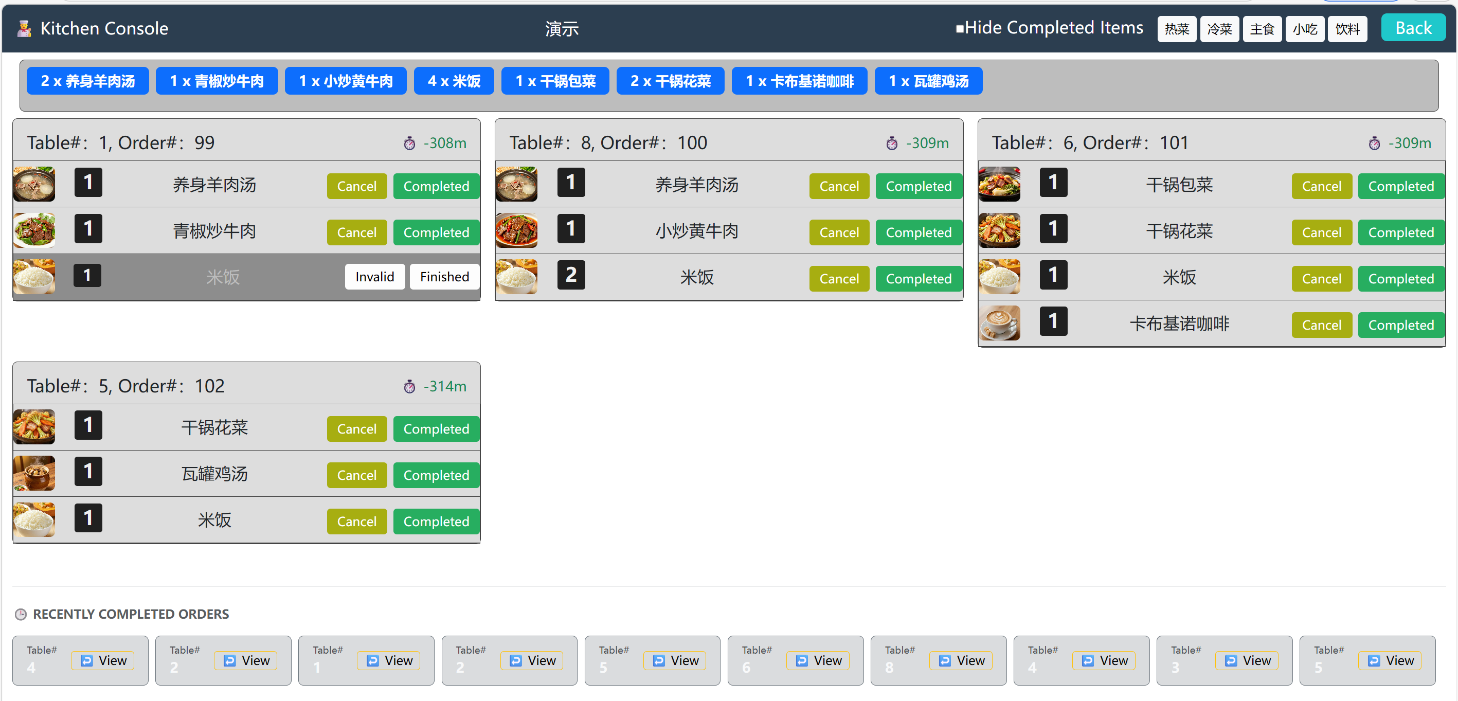 Customer orders appear directly in the kitchen queue; once an order is completed, waiters are immediately notified to pick it up.