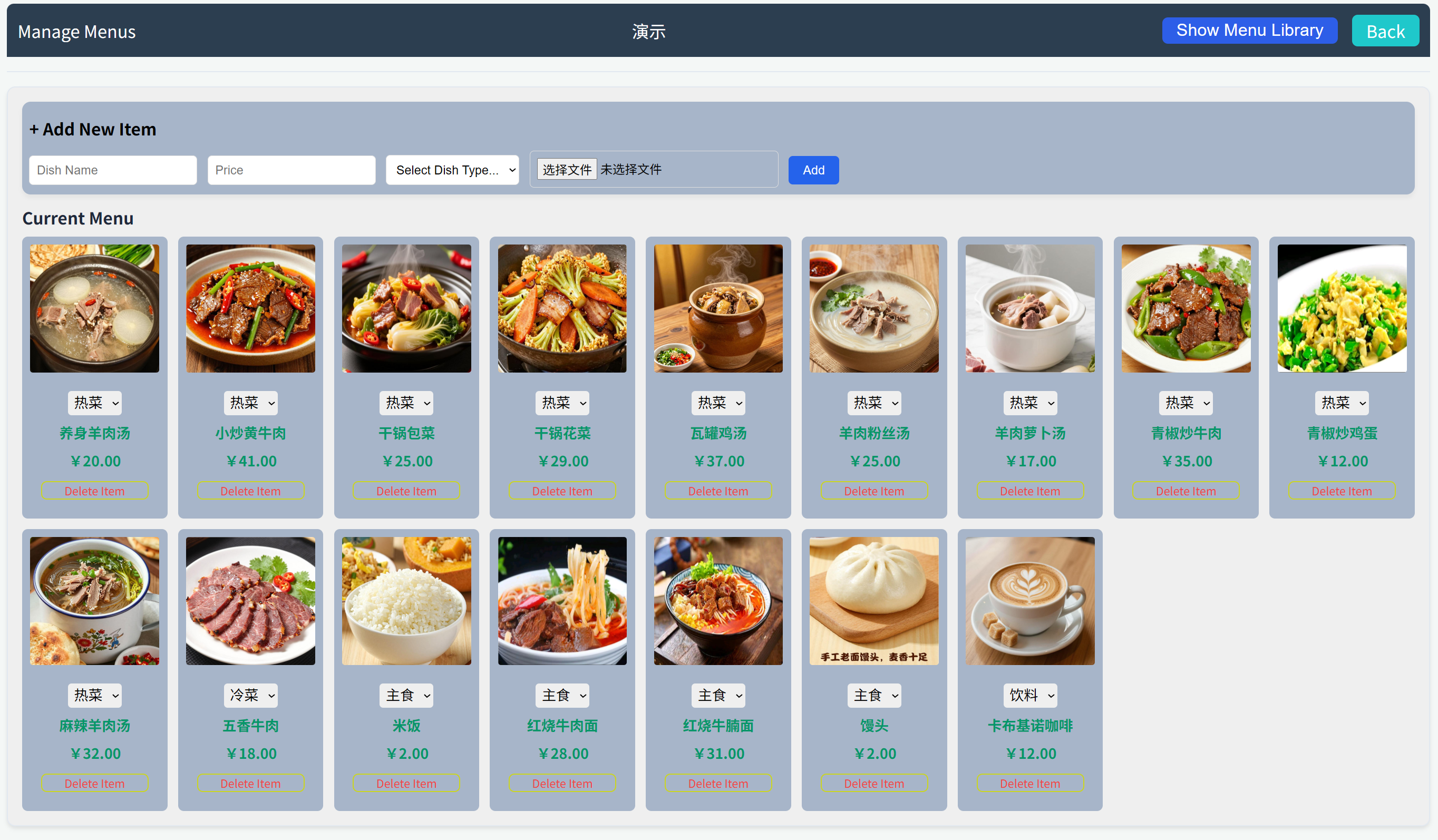 Add dishes, modify unit prices, change dish names, update dish categories, and import dishes from the standard menu library.
